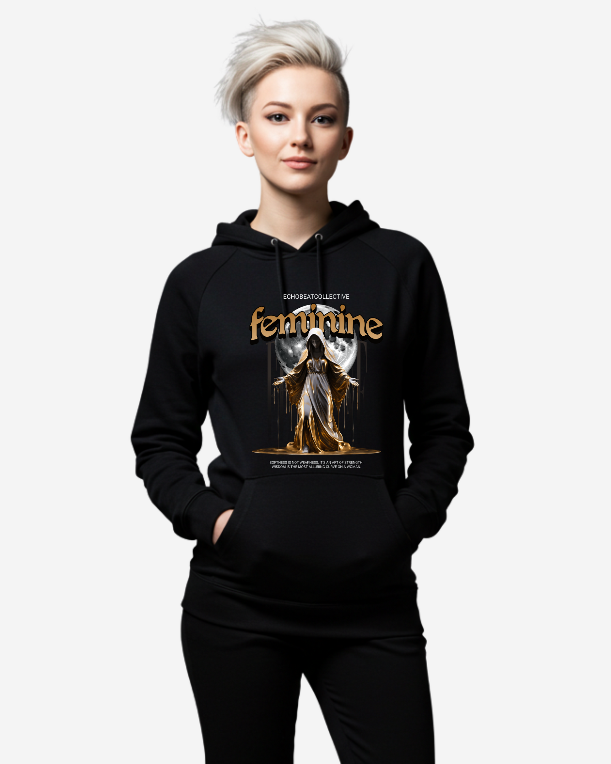 The Feminine Women's Oversized Hoodie merges mysticism with bold femininity, creating a strikingly symbolic design. Featuring a hooded figure in a flowing metallic robe, with liquid dripping from their hands, this artwork evokes themes of transformation, power, and fluid identity. The glowing full moon behind the figure enhances the mysterious and celestial aura, while the bold "FEMININE" typography reinforces the piece's confident message.