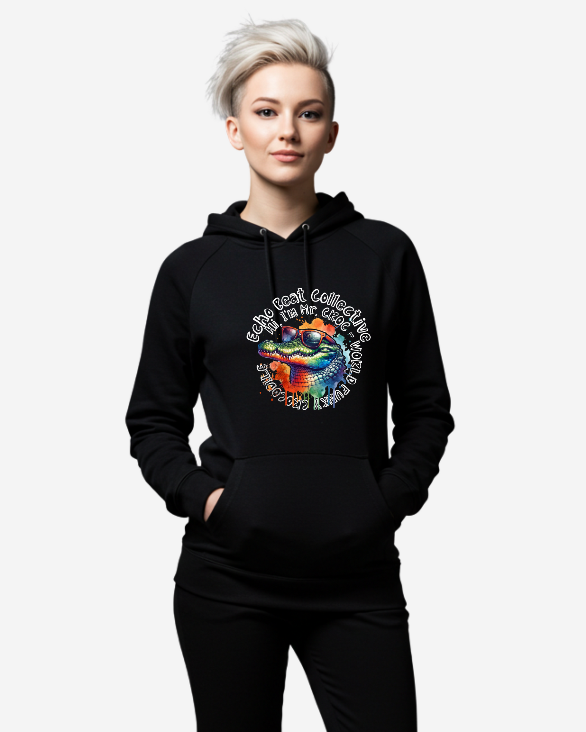 The Mr. Croc (Crocodile) Women's Oversized Hoodie merges funky street style with a bold artistic edge. Featuring a vibrant illustration of a crocodile rocking sunglasses, splashed with electric green, blue, and orange hues, this design exudes confidence, energy, and an unmistakable groove. The playful "Hi, I'm Mr. Croc" typography, alongside the "World Funk Crocodile" tagline, reinforces its lively, music-inspired aesthetic.