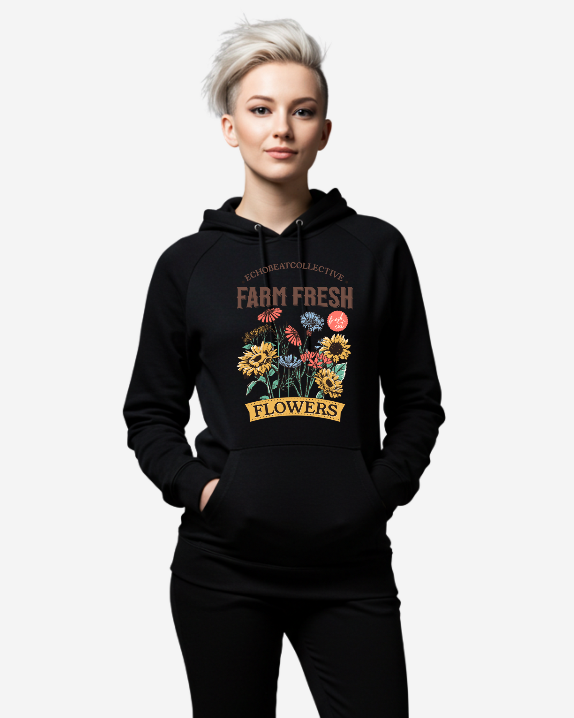 The typography “FARM FRESH” in bold, vintage-style lettering, paired with “FLOWERS” in a classic banner, reinforces the hoodie’s theme—embracing organic beauty, natural abundance, and the simple pleasures of farm-grown florals. The circular “fresh cut” label adds a charming touch, making this hoodie a perfect piece for lovers of countryside aesthetics and floral-inspired fashion.